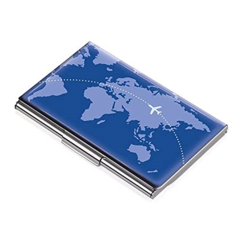 Porte cartes de visite de marque TROIKA, motif: Around the world, plat, pour 11 cartes env., métal, chrome, brillant, Bleu